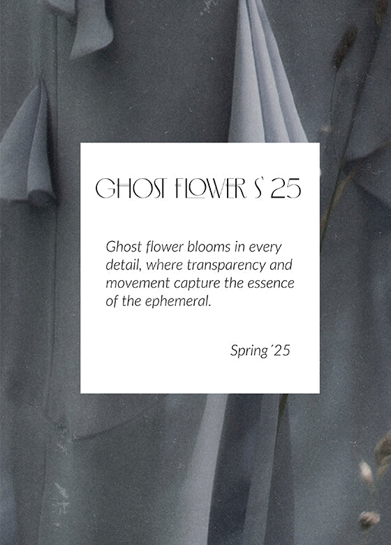 Ghost Flower se despliega en una paleta de ensueño donde los pasteles suaves —lila, rubor suave y azul agua— susurran delicadeza y ligereza, capturando la belleza efímera de la primavera. Los tonos neutros, desde el beige bañado por el sol hasta los blancos lavados, aportan serenidad, mientras que el negro intenso contrasta como sombras al atardecer, añadiendo profundidad a lo etéreo. Las transparencias y las capas ligeras permiten que la luz baile sobre cada pieza, creando un efecto ligero, casi sobrenatural: fluido, poético e indomable.