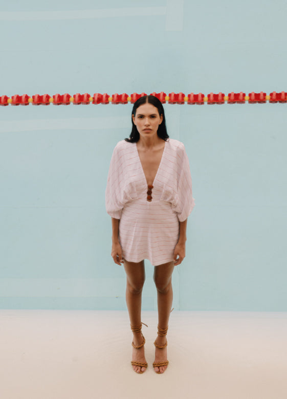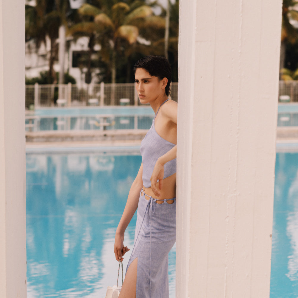 A través de suaves drapeados y detalles náuticos, nos transporta al recuerdo nostálgico de un idílico día de verano.