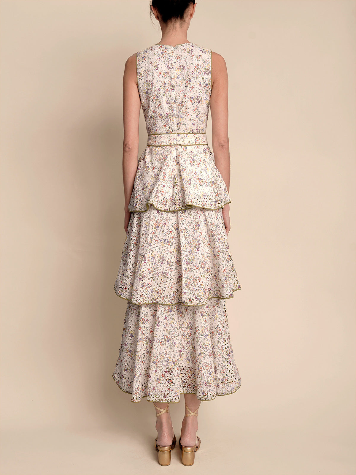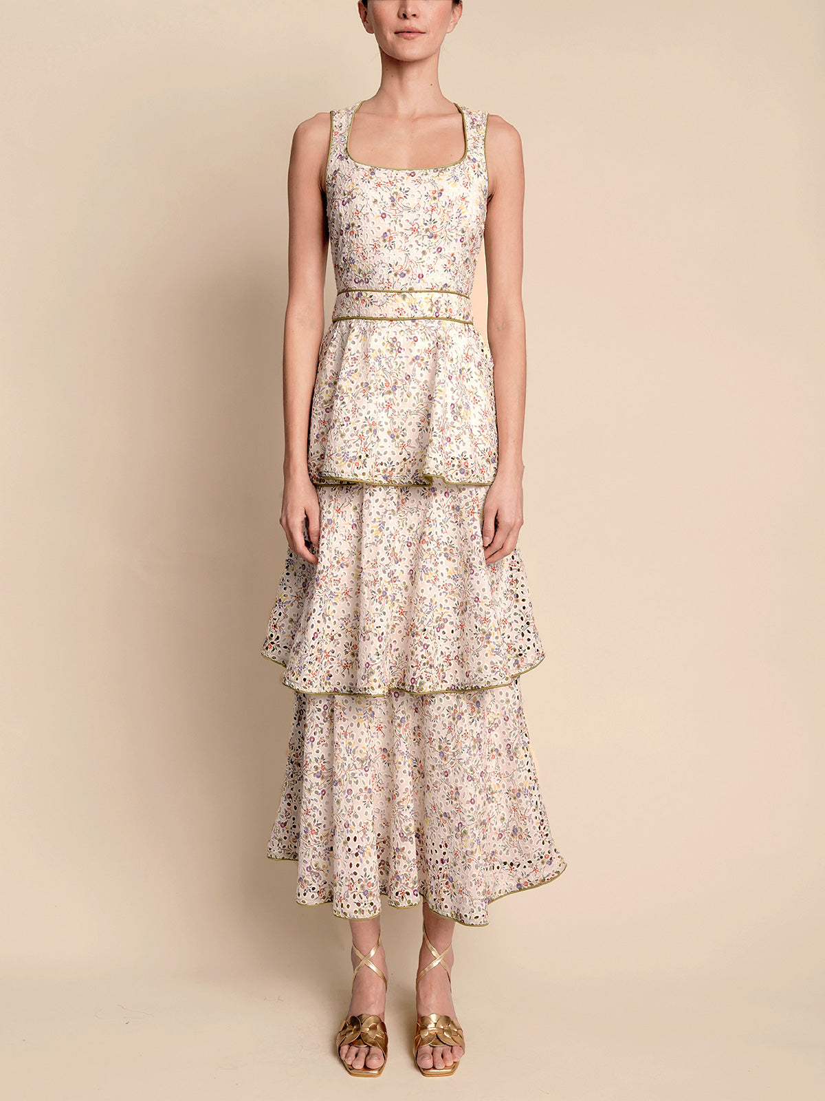 El vestido Anaya irradia un encanto atemporal con su corte de largo medio. Con un corpiño ajustado de escote cuadrado y una divertida falda con volantes, todo confeccionado con ojales de algodón floral, es perfecto para disfrutar del calor del verano.