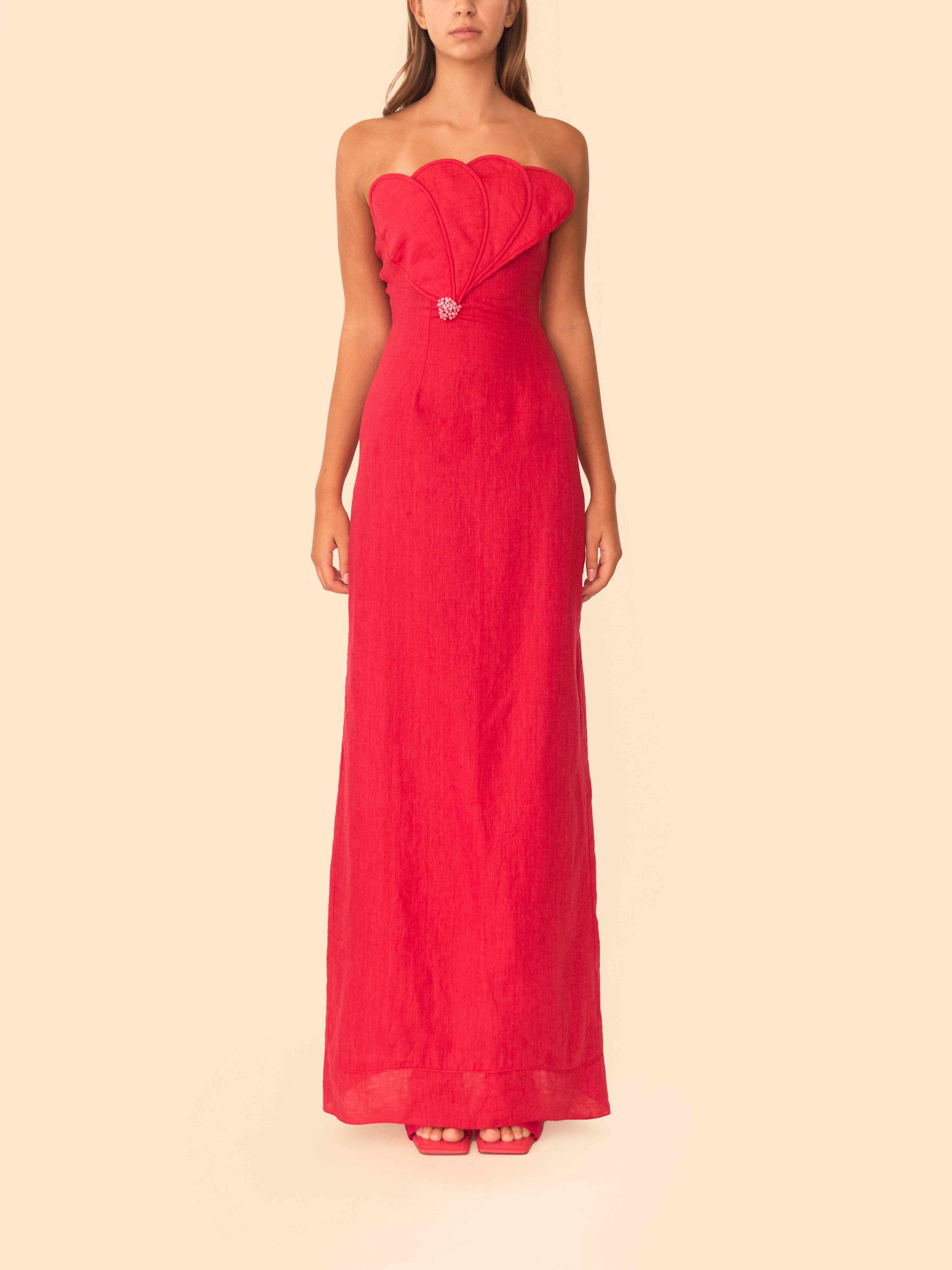 The Bianca Dress reimagines the timeless strapless silhouette with floral scallops that bloom softly along the neckline, creating a delicate yet powerful statement.