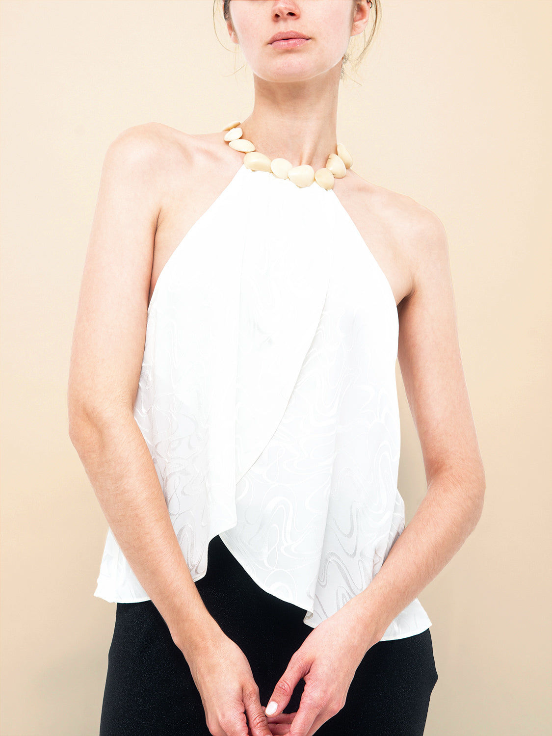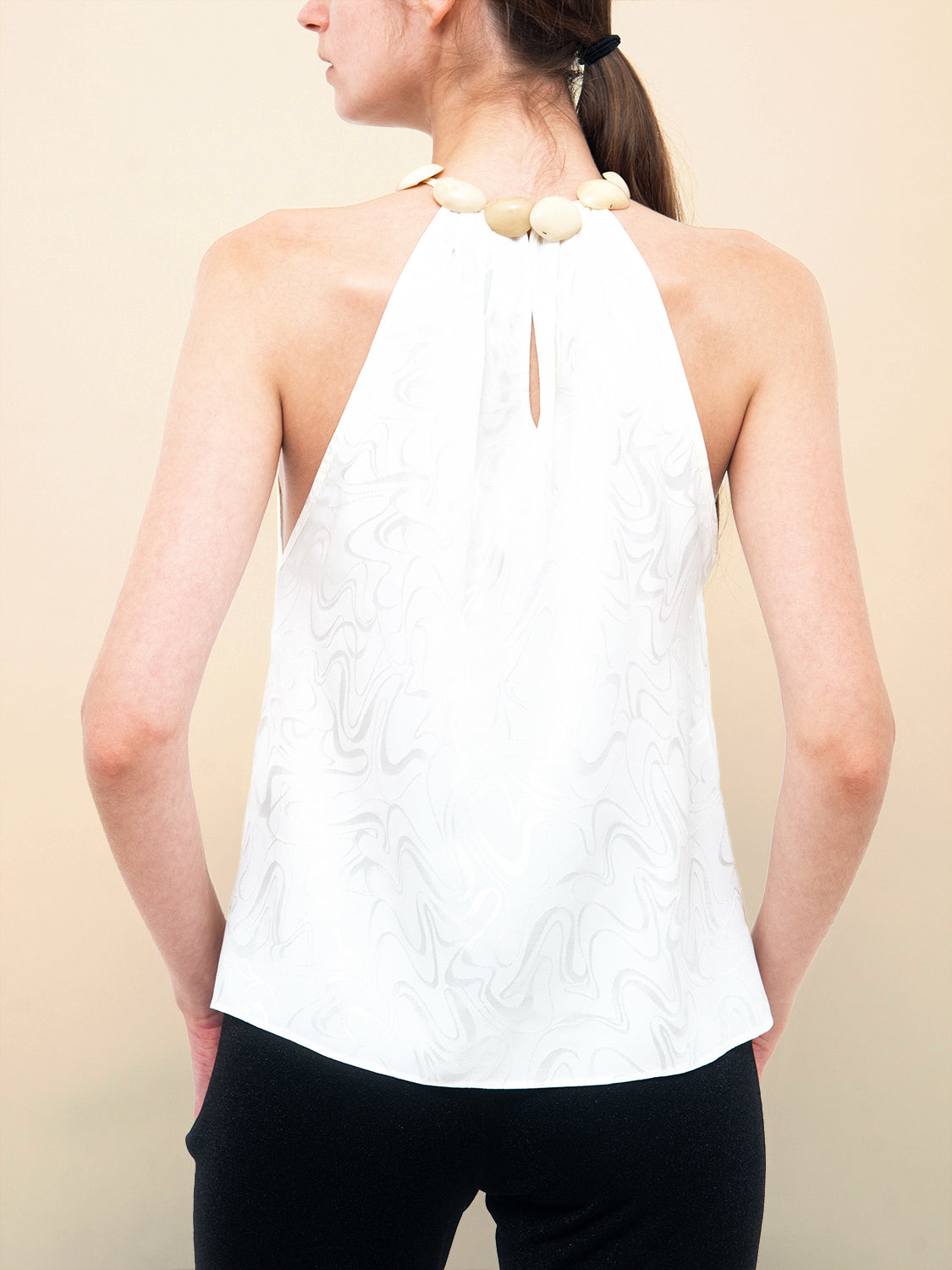 El top Liz es una elegante prenda sin mangas con un elegante escote halter cruzado. El escote está adornado con taguas, lo que le aporta un toque elegante. Confeccionado en jacquard de viscosa, luce un diseño de espirales que lo convierte en una prenda moderna y versátil para cualquier armario.