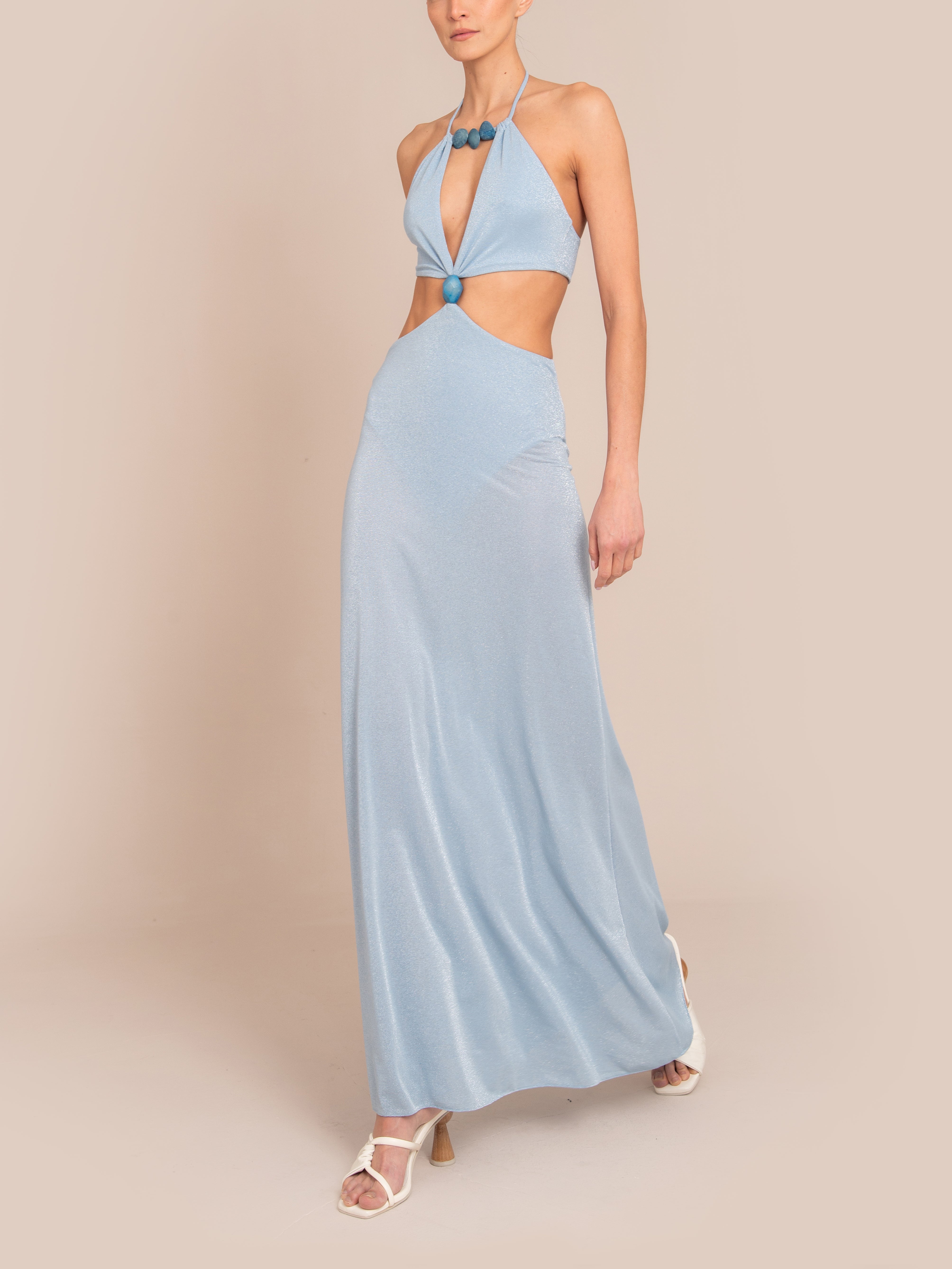 El VESTIDO LORRAINE es la definición del glamour natural. Diseñado en una tela brillante y fluida, se extiende sobre el cuerpo con un suave brillo, creando movimiento y reflejos de luz a cada paso. El escote halter pronunciado está decorado con esculturales cuentas de tagua, que le aportan un toque orgánico y artesanal.