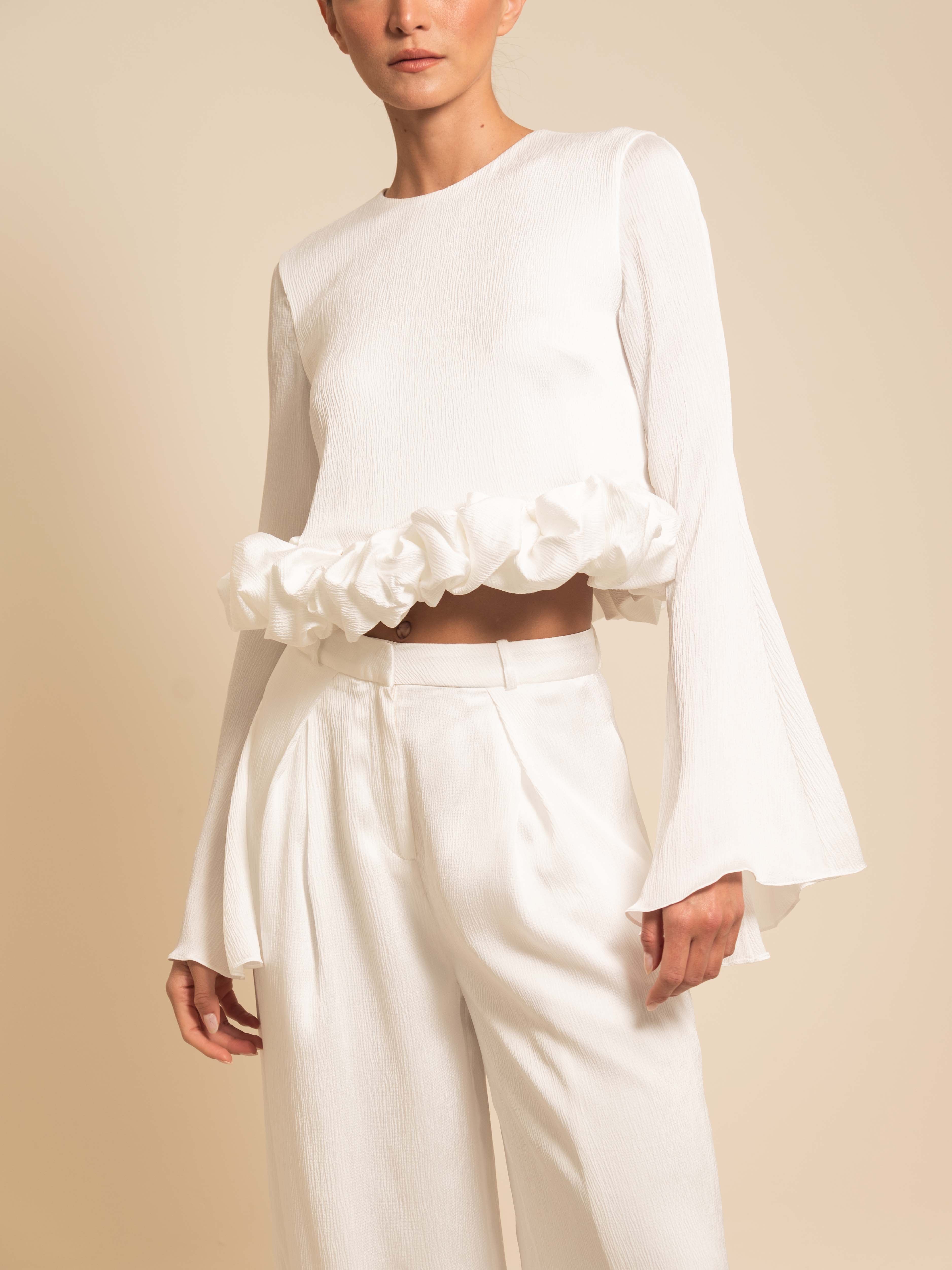 The Maggie Blouse is a statement top crafted in a lightweight textured ivory fabric that flows with ease. Designed with flared sleeves and a sculptural ruffle detail at the waist, it creates movement and volume while keeping a sleek, modern silhouette.
