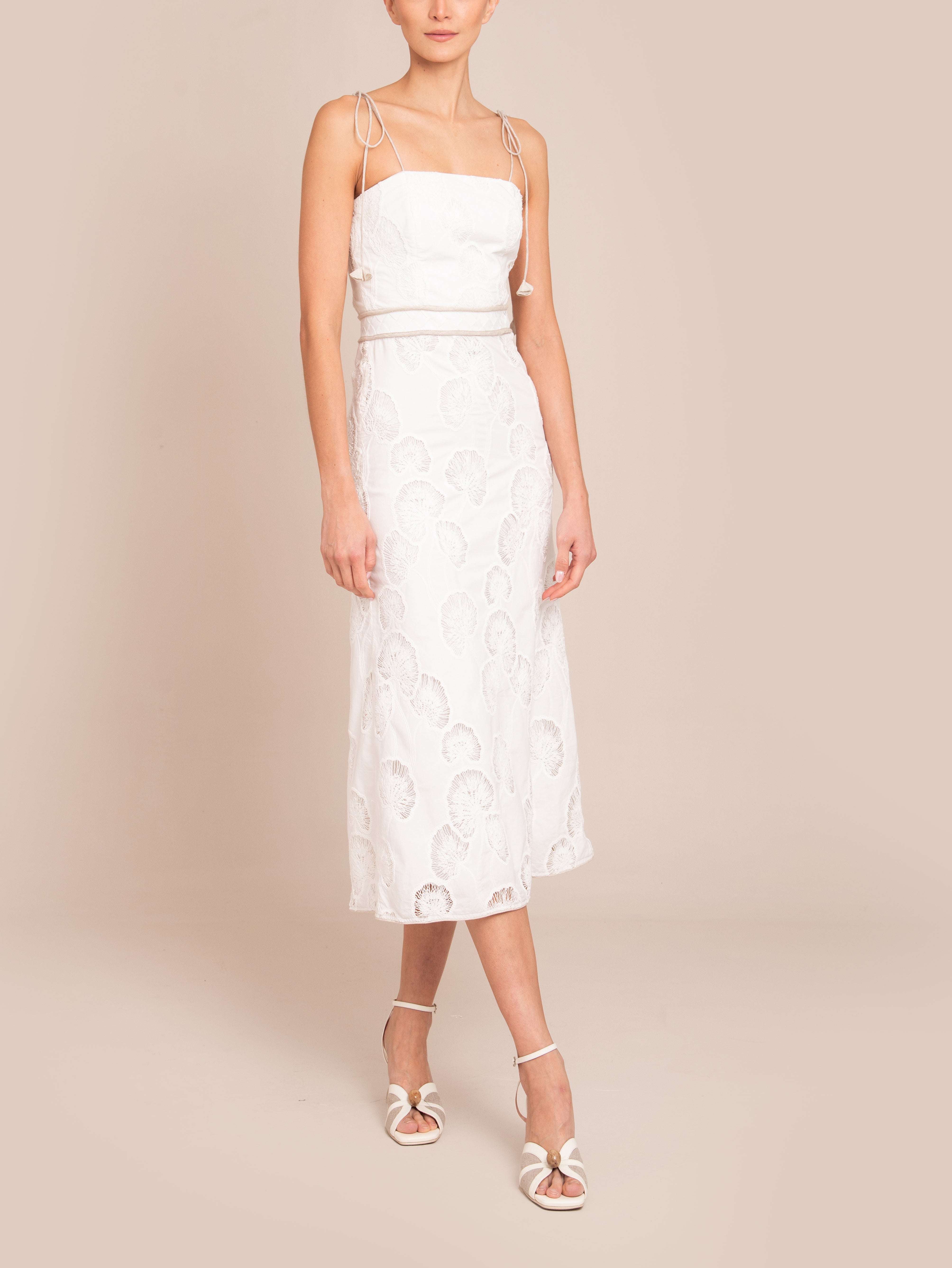 El VESTIDO MERISSA es un estudio de la artesanía moderna, que combina estructura y fluidez. Confeccionado en algodón bordado con intrincados cortes botánicos, ofrece una sutil transparencia que juega con la luz y el movimiento. El elegante escote cuadrado y los delicados tirantes añaden un toque refinado, mientras que la cintura ajustable permite un ajuste personalizado.