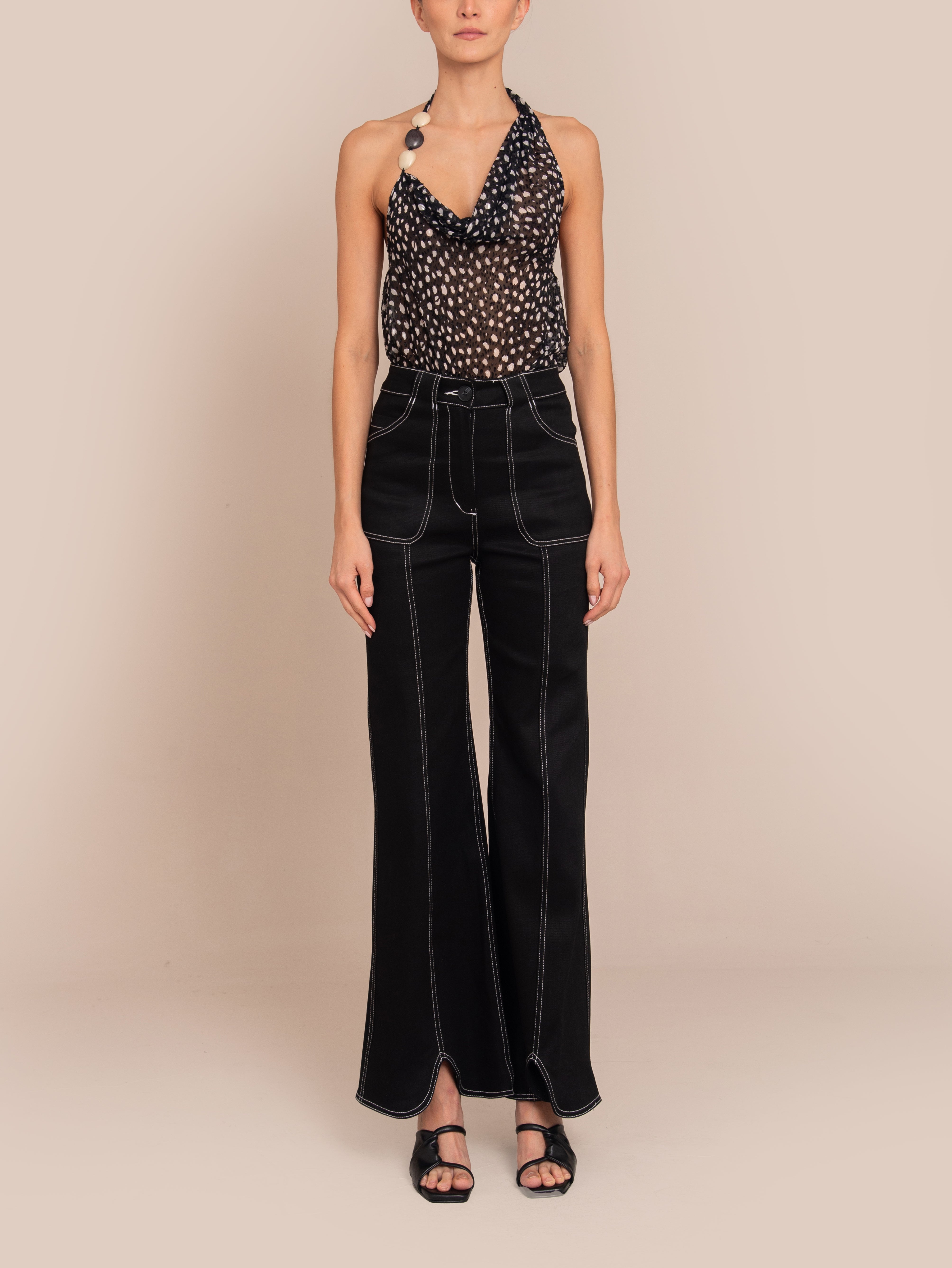 El top Picoso es un top sin mangas que combina la artesanía con la elegancia sin esfuerzo. Diseñado con un suave escote de pico drapeado, se adapta maravillosamente al cuerpo y crea una silueta relajada pero refinada. El detalle más destacado son sus apliques de tagua hechos a mano, de origen sostenible y dispuestos meticulosamente a lo largo del escote para aportar un toque de sofisticación orgánica. Confeccionado en un tejido vaporoso y semitransparente con un delicado estampado, es perfecto para el día y la noche. Combínalo con pantalones de sastrería o Jeans de cintura alta para conseguir un look contemporáneo y atemporal.