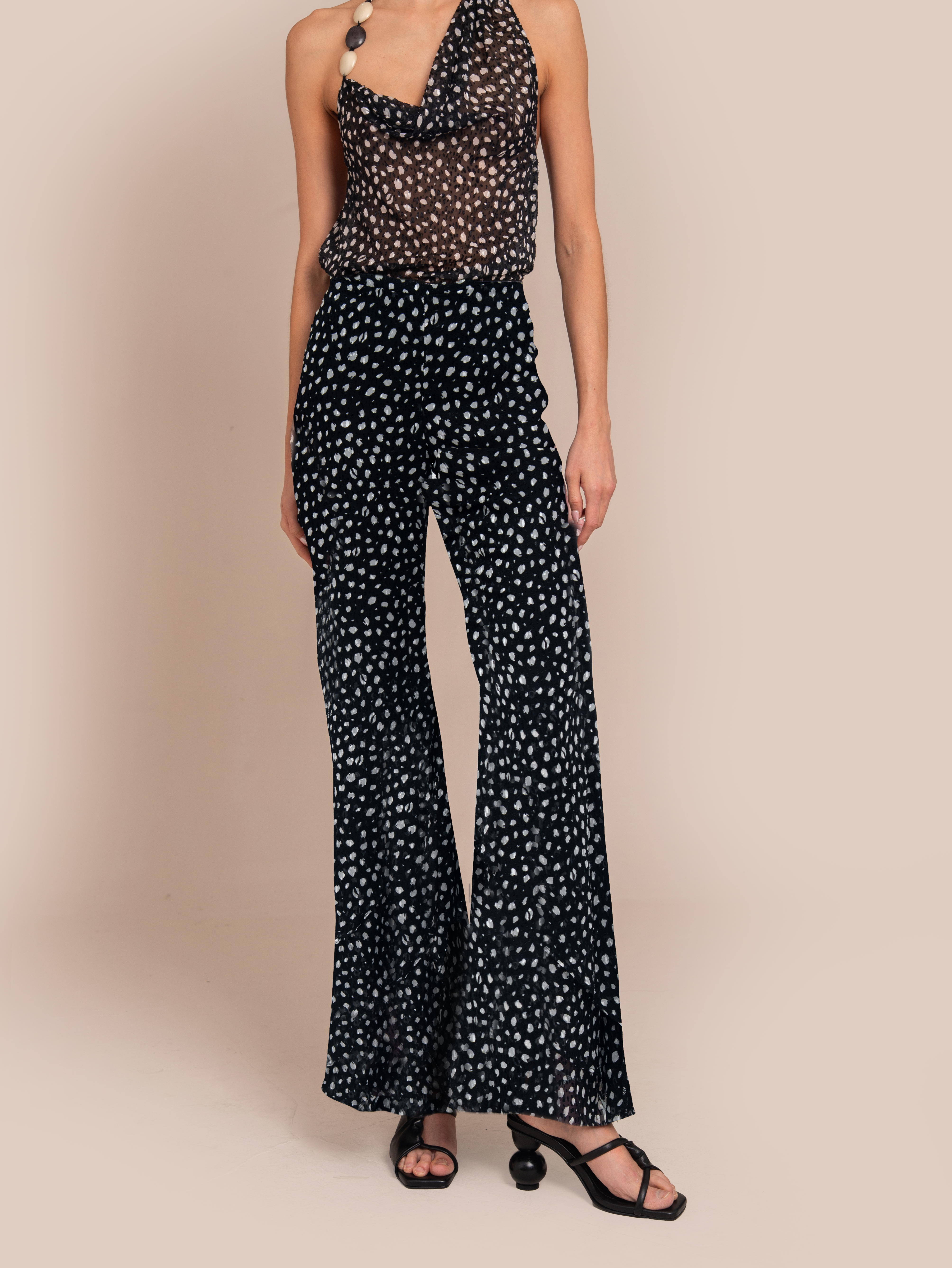 El pantalón Sarabi está confeccionado en seda con un exclusivo estampado de lunares que se mueve entre el misterio y la luz. Diseñado con una silueta de cintura alta que alarga la figura, esta prenda se transforma en un corte amplio y vaporoso de pierna ancha, creando la ilusión de movimiento infinito.
