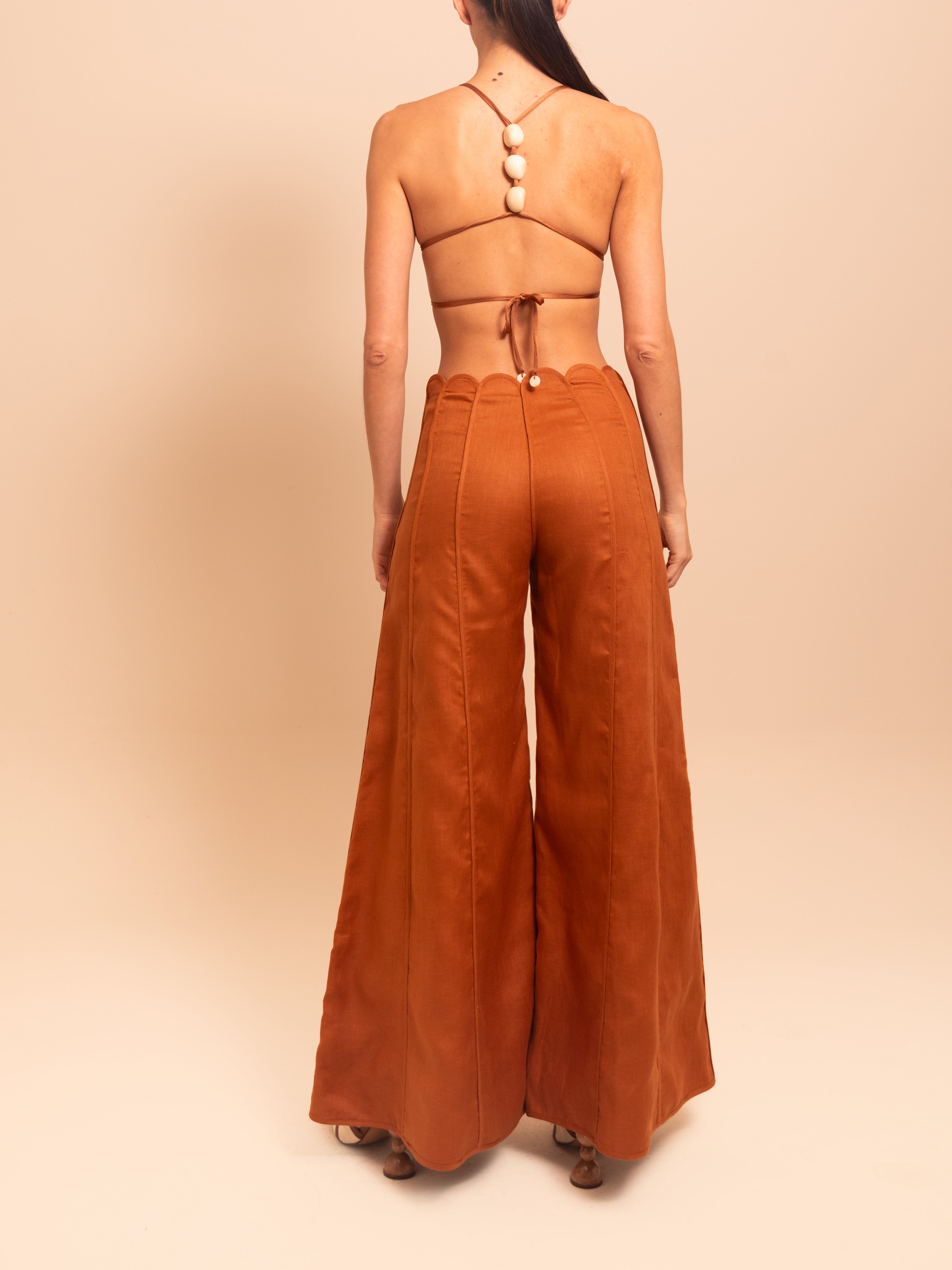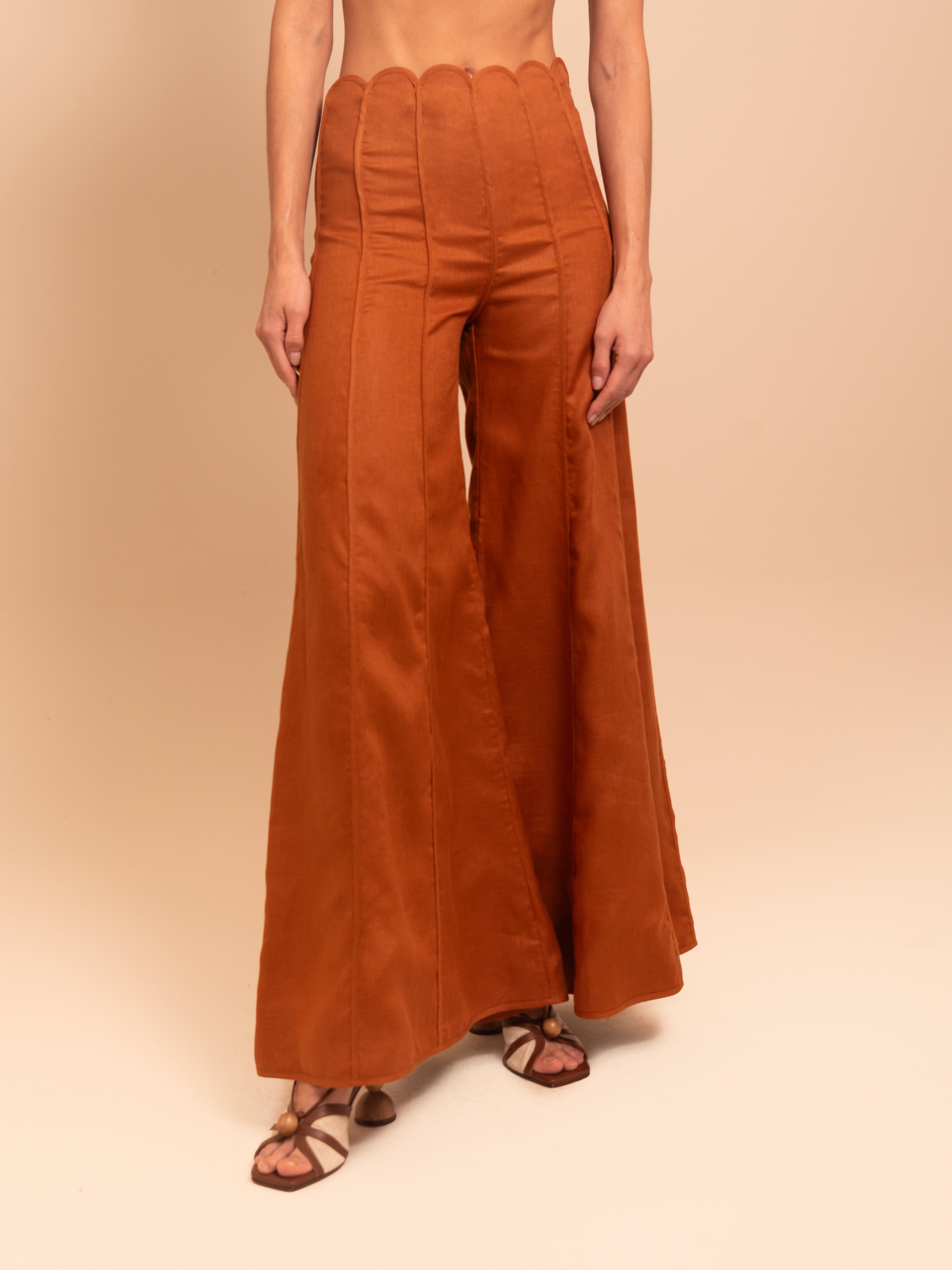 The Sariah Pant brings a modern twist to wide-leg tailoring with its dramatic flared silhouette and sculptural scalloped waistband. Made from a structured linen-blend fabric, it elongates the leg with vertical seams and creates movement with every step. Designed to sit high on the waist, it pairs effortlessly with minimal tops or matching swimwear for a bold vacation look.