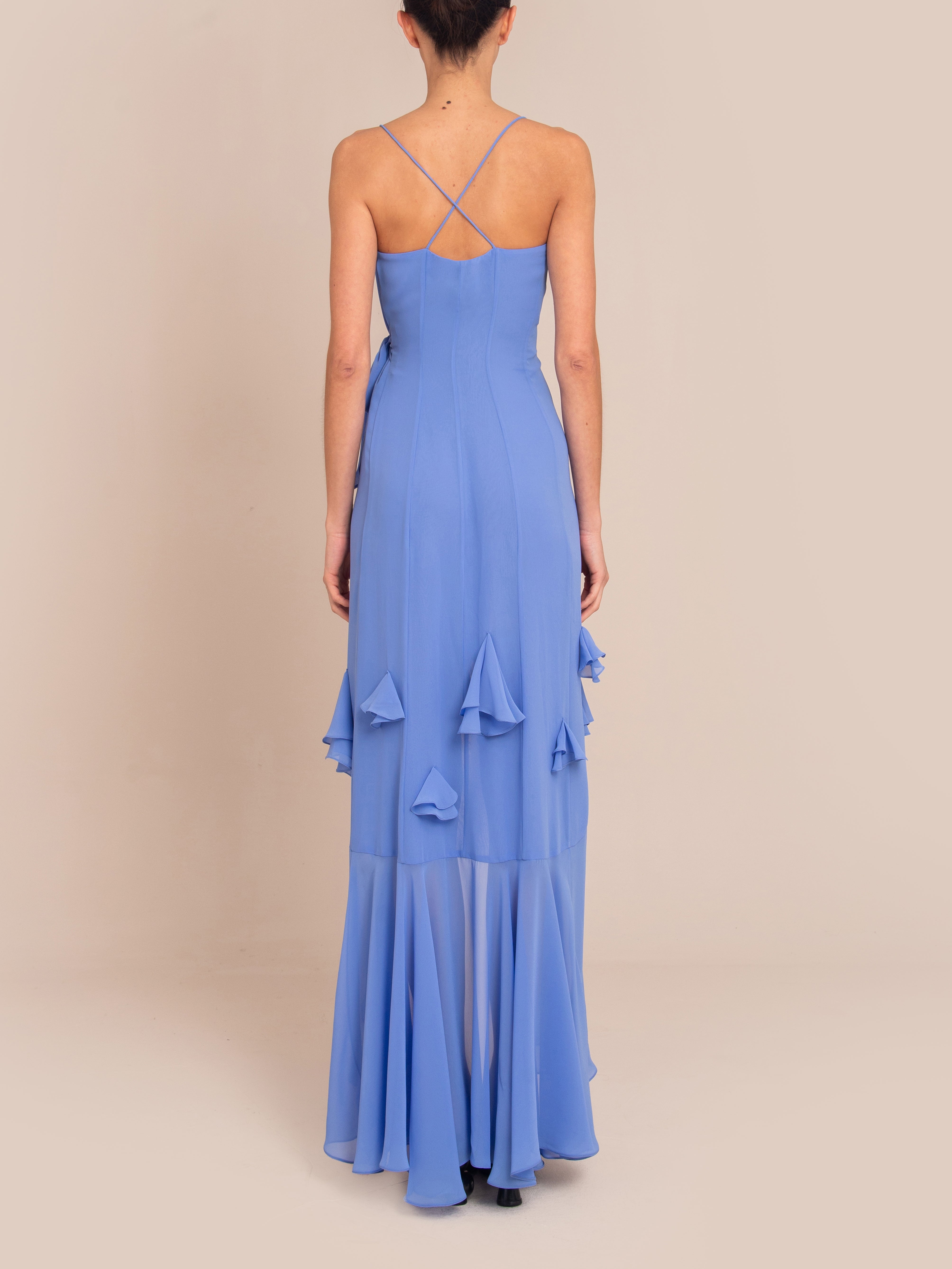 El vestido Terra es una obra maestra fluida y romántica, confeccionada en chifon ligero para crear un movimiento etéreo a cada paso. Diseñado con una silueta envolvente, presenta un favorecedor escote en V y delicados tirantes finos que se cruzan con elegancia en la espalda. Los detalles de volantes en cascada a lo largo del dobladillo asimétrico añaden un toque dinámico, mientras que los apliques florales en tejido a juego realzan sutilmente su estética orgánica y escultural. Perfecto para eventos nocturnos o veladas veraniegas, este vestido encarna la feminidad innata. Combínalo con tacones minimalistas y accesorios delicados para conseguir un look elevado y elegante.