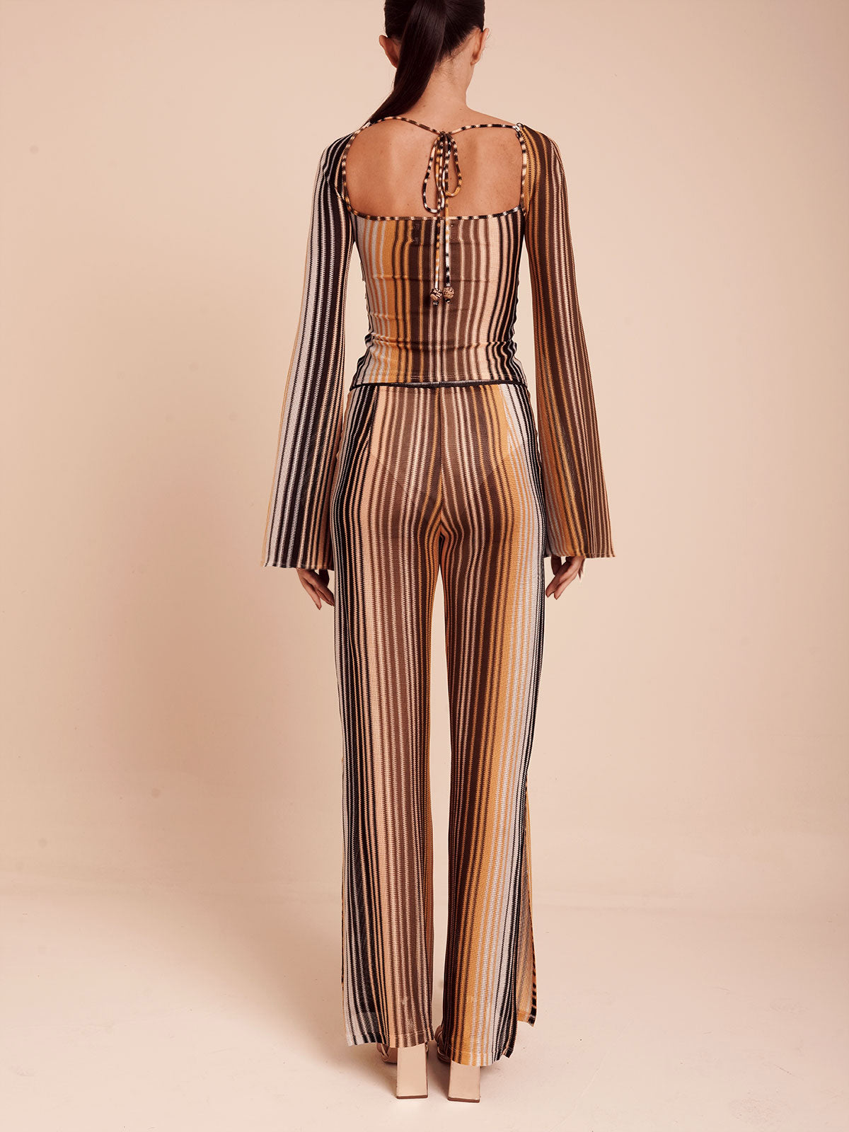 Victoria pant, These high-waisted pants feature a long silhouette and are made from lightweight knit fabric that flows smoothly and structurally around the body. The vertical stripe design slims the figure, while the side slits add movement and a contemporary touch.
