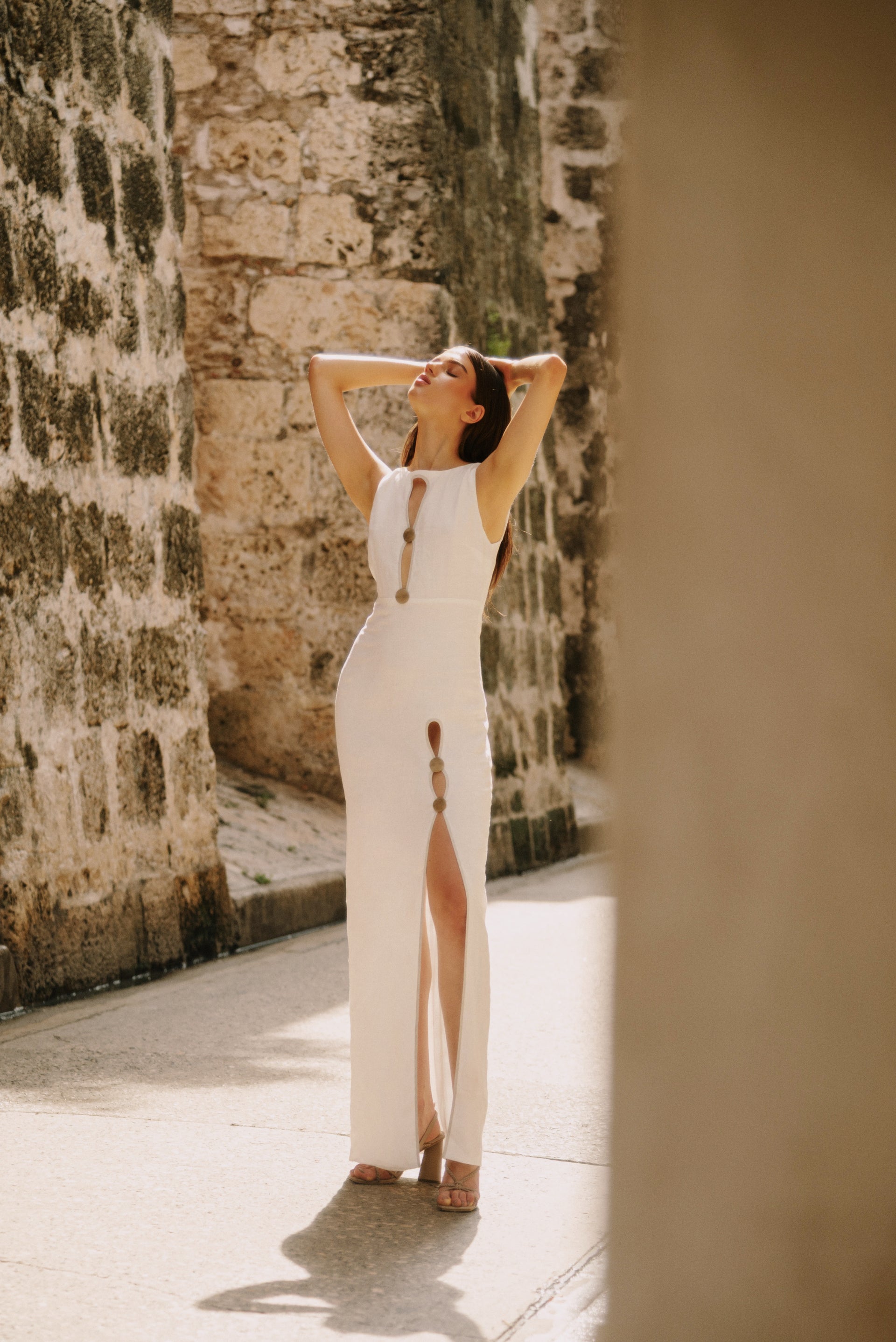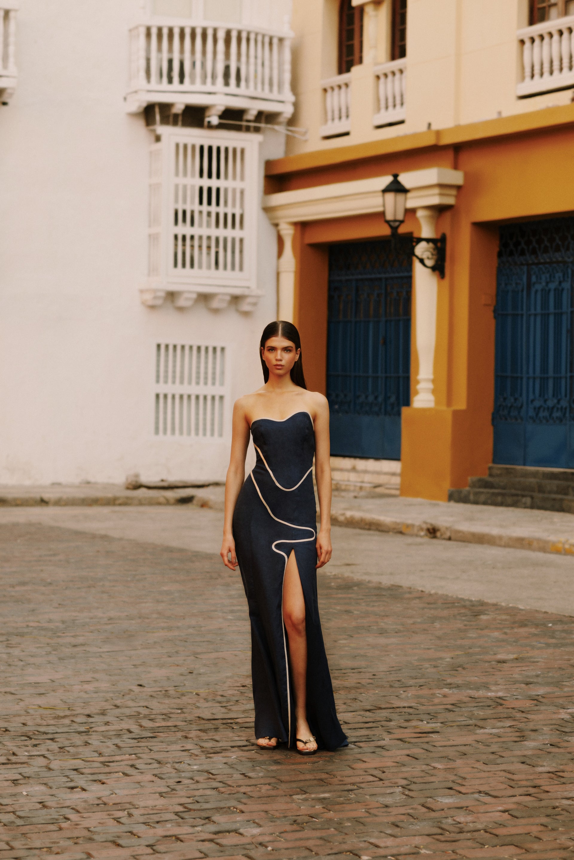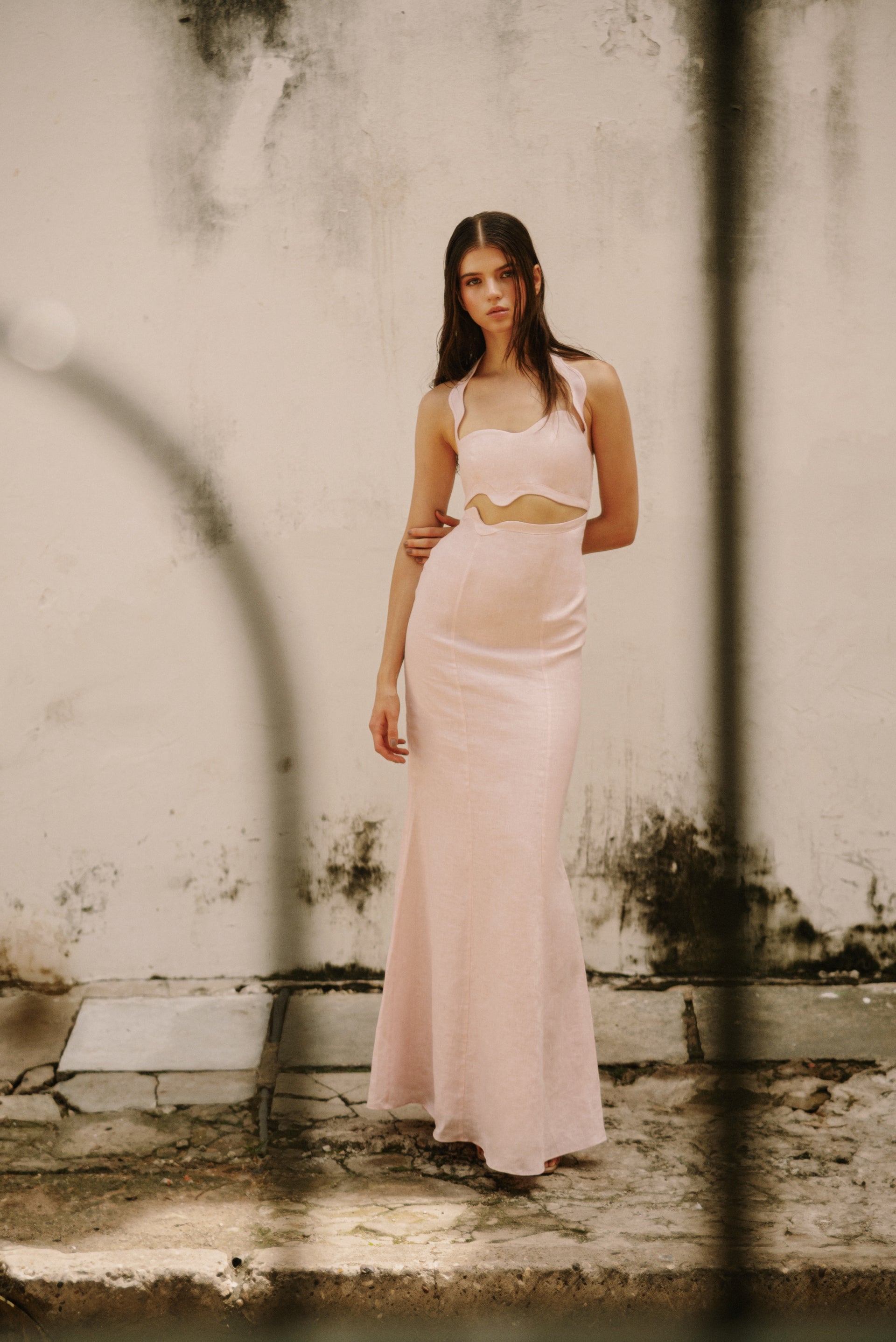 Sculptural lines balance structure and fluidity, draping the silhouette in light, vaporous materials, full of movement and ease.