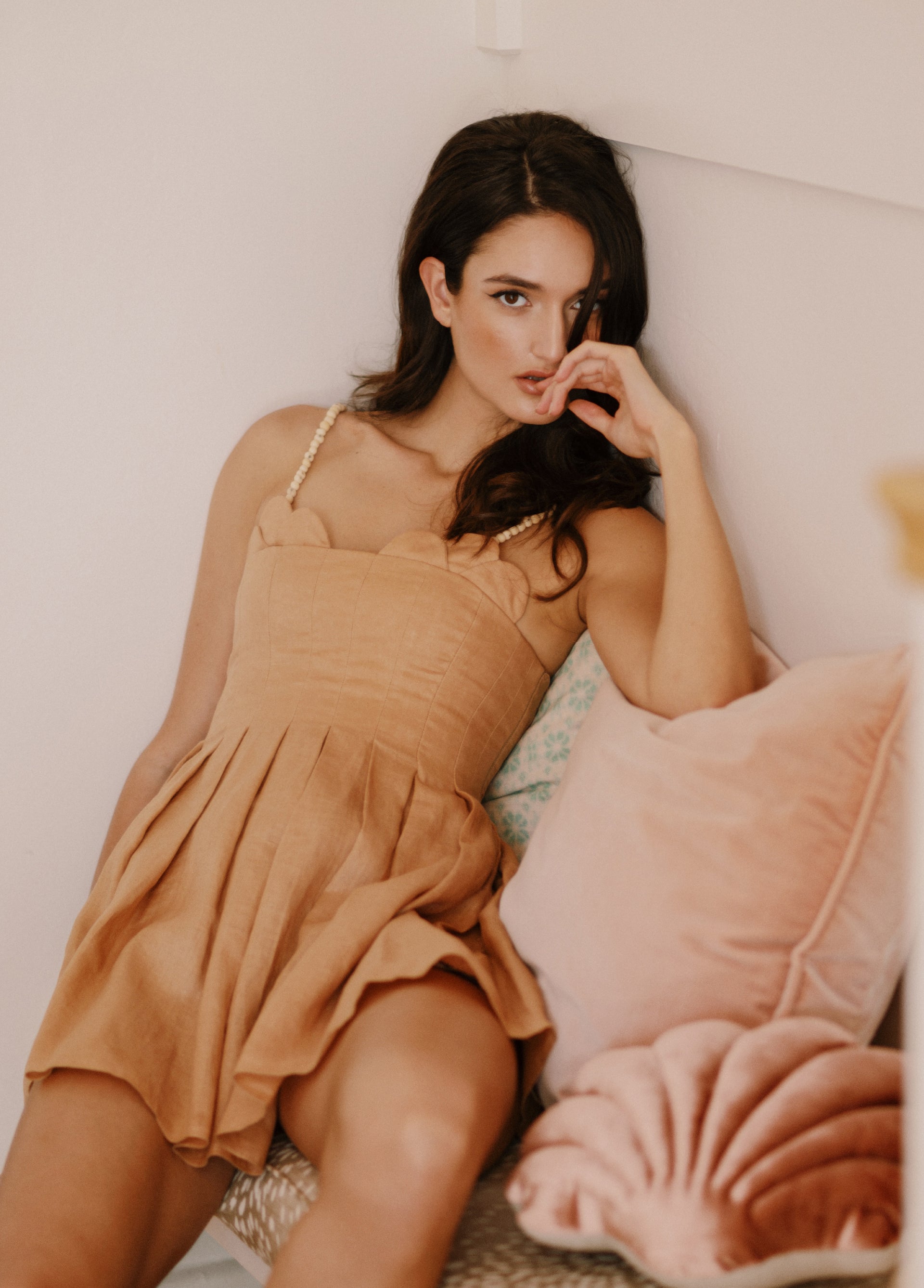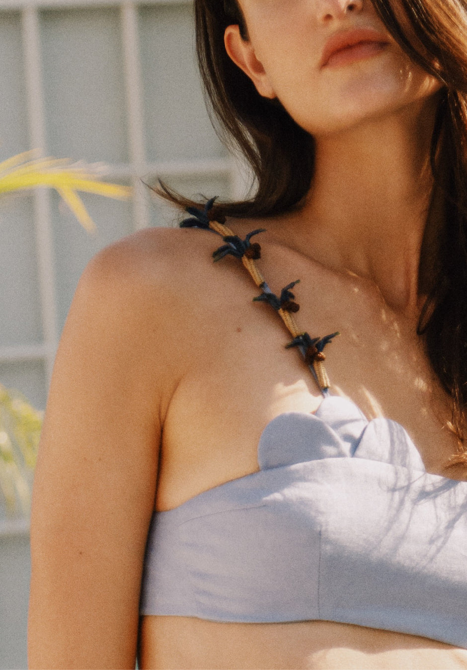 Light, fluid fabrics that move with the body. Delicate contrasts, artisanal embroideries, and scallops inspired byflower petals. A collection that invites you to live with freshness, movement, and sensuality.