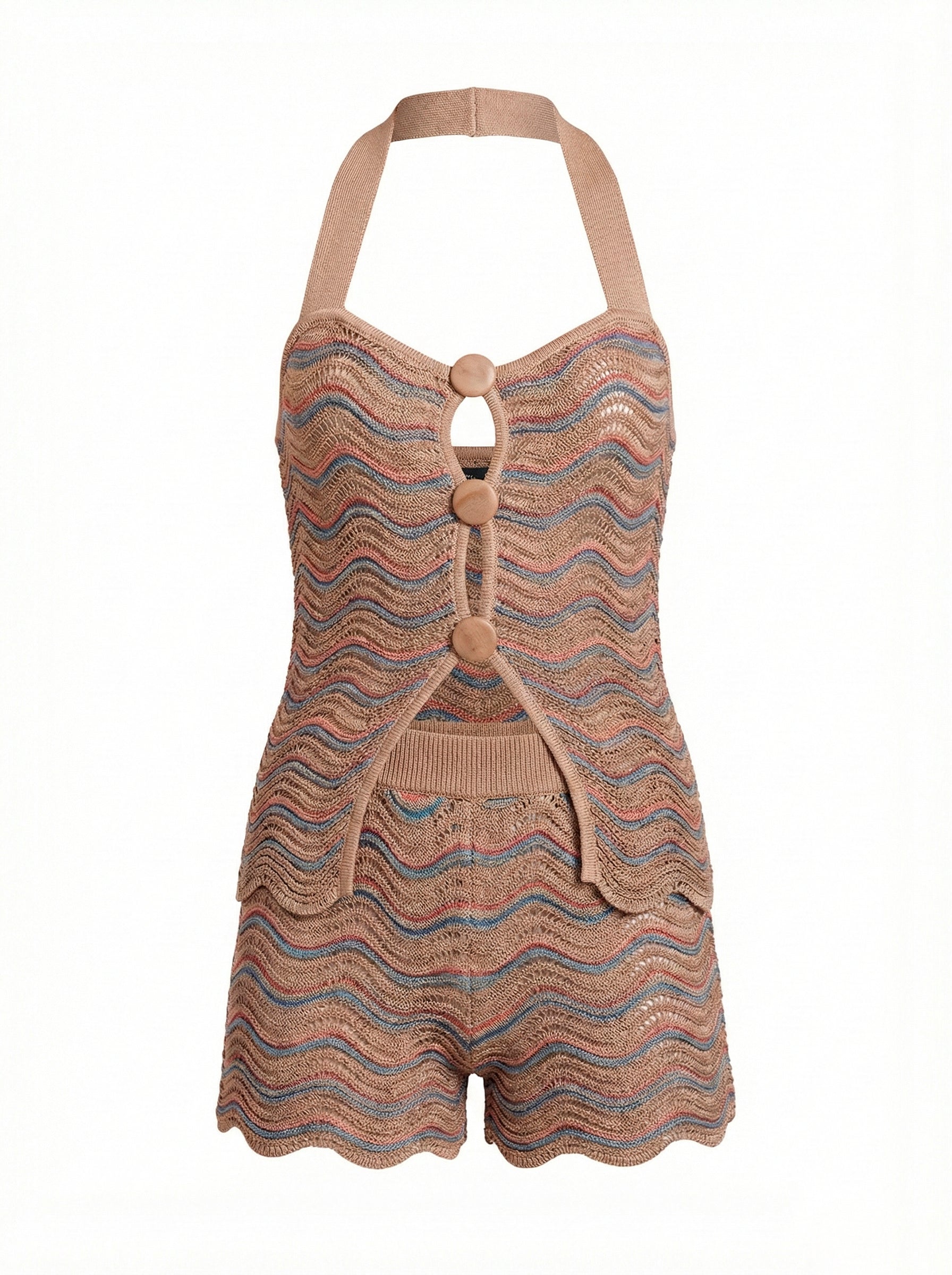 Amari Top is a halter neck top with a feminine and defined silhouette, made from knitwear with a wavy texture that adds movement and visual depth. It has a structured neckline with a front opening and large central gussets that create a graphic and contemporary look. The contrast on the neckline and the finishes frame the silhouette with precision and character.