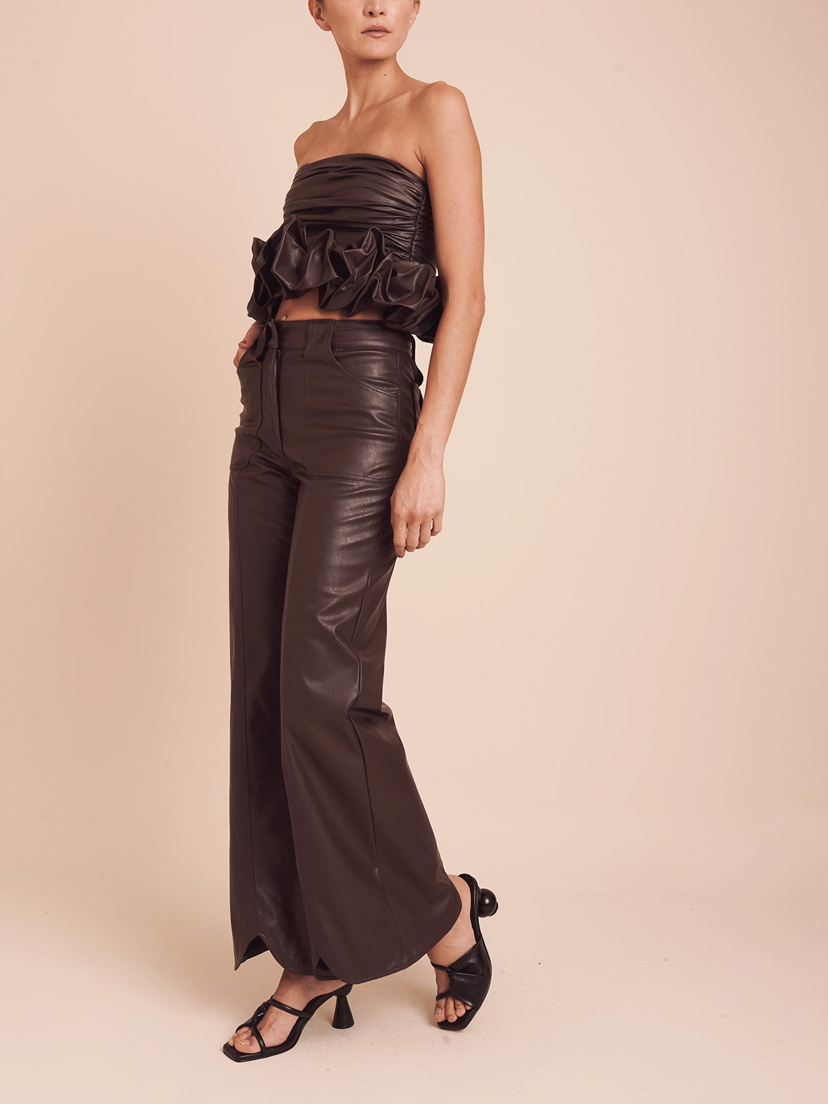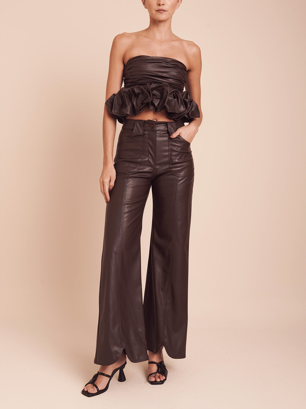 Cut from supple leather, the Josefa Pant in Espresso offers a polished yet modern silhouette. Designed with a high-rise waist and wide-leg fit, it features tailored seaming, functional pockets, and subtle front slits at the hem for ease of movement.