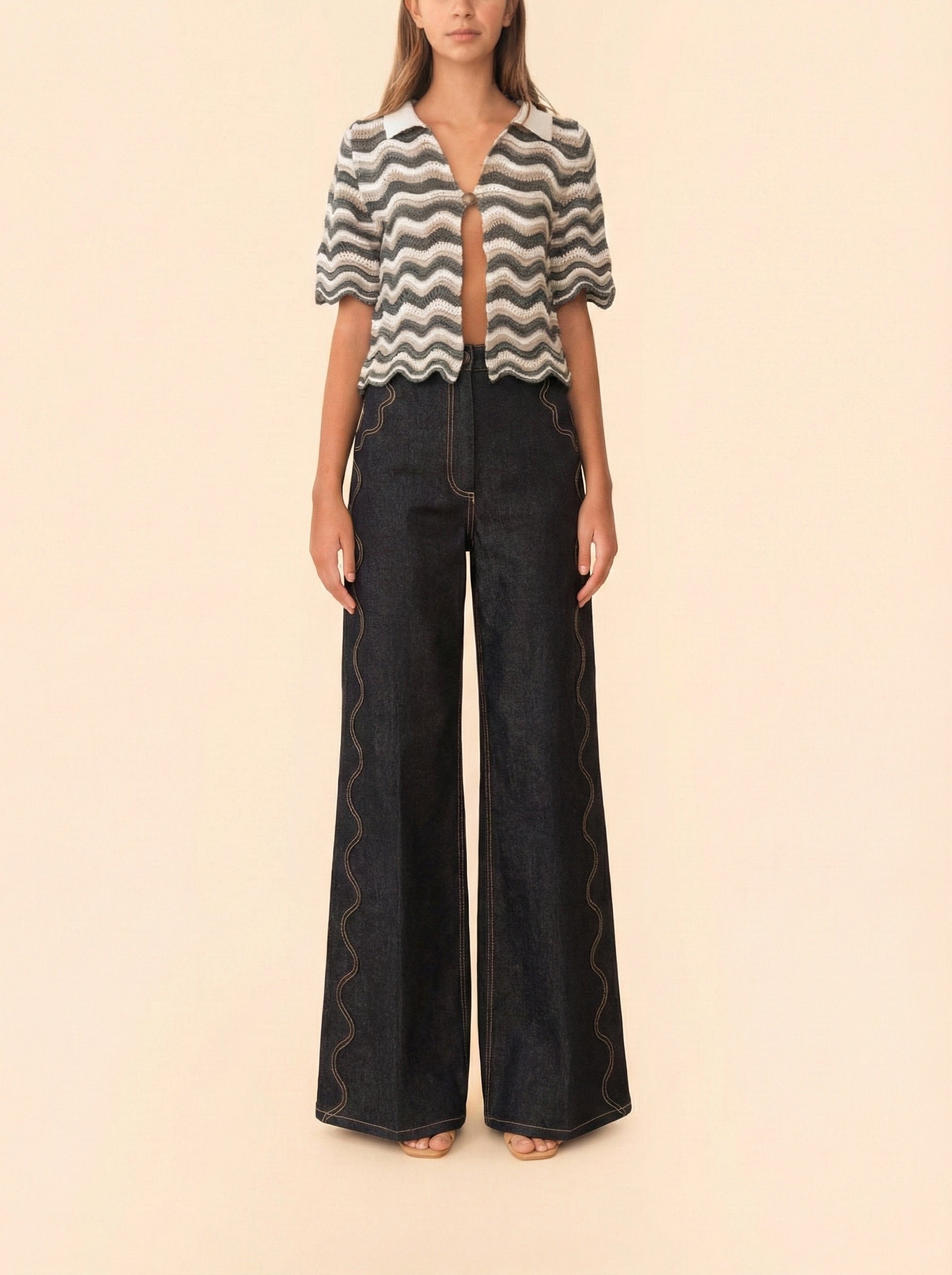 The Malai Jean, made in 99% cotton with a touch of stretch, features a high-rise fit and wide-leg silhouette that elongates the figure.