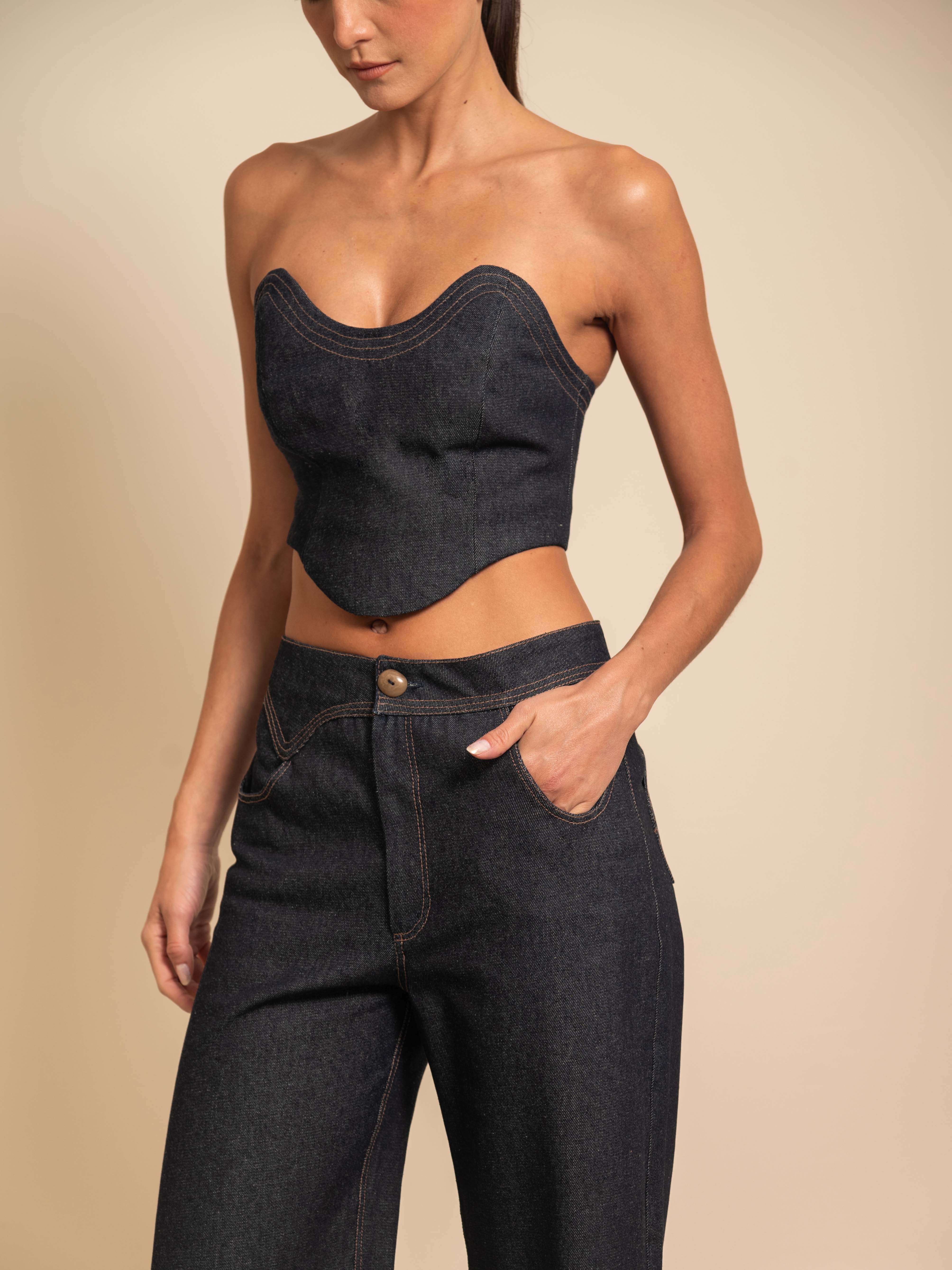 The Micah Top is a structured strapless bustier crafted in dark denim with contrast stitching that highlights its architectural lines. Featuring a sweetheart-inspired neckline and a sculpted hem, it creates a flattering silhouette with a modern, minimal edge.