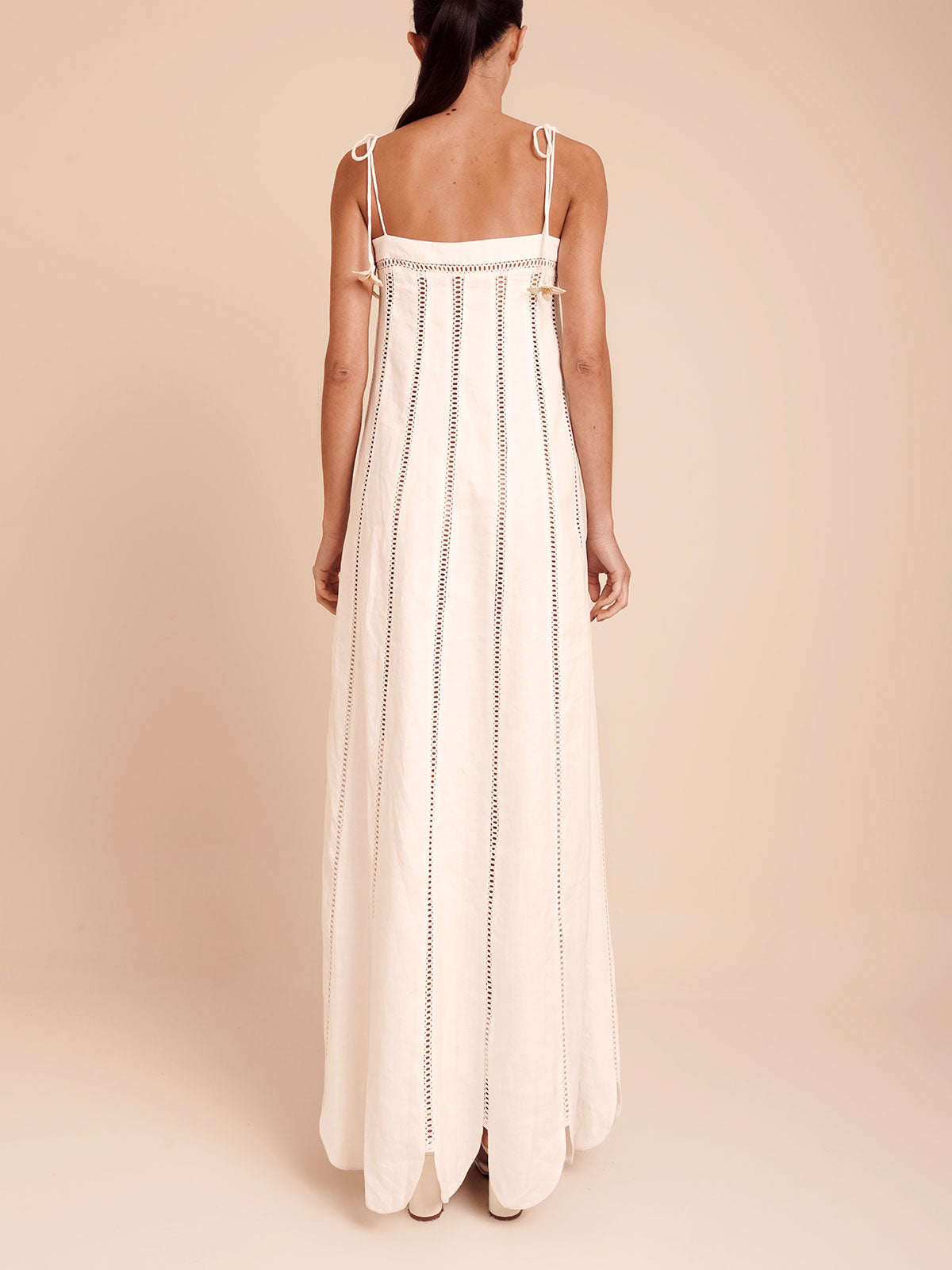 Nilo Dress is a long dress with a flowing, vertical silhouette, made from 100% linen. Its design is defined by linear bobbles that run down the body, adding visual lightness and rhythm. It features adjustable straps with handmade iraca palm flower details and a scalloped hem that reinforces its delicate, architectural character.
