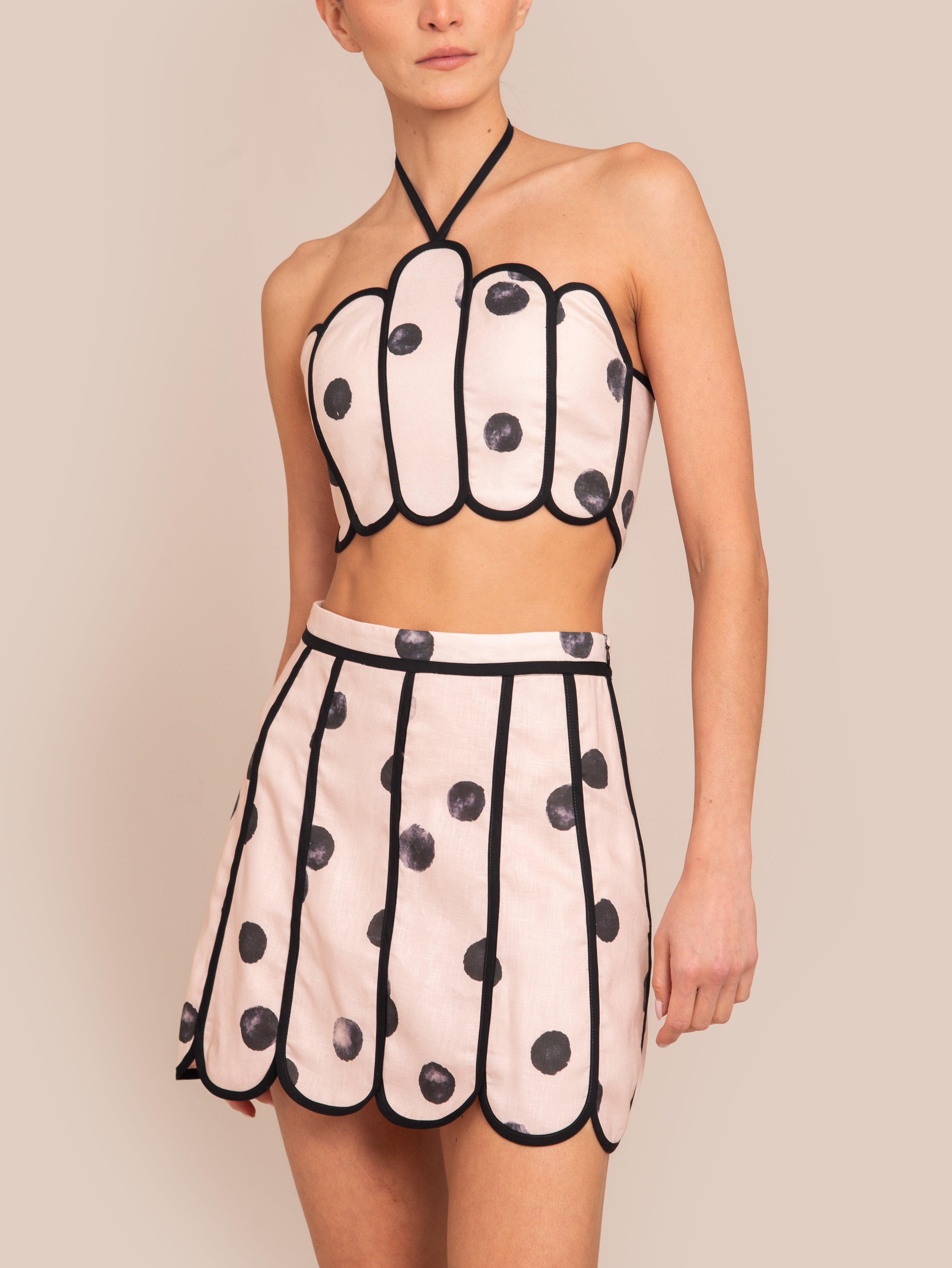 The Sunrise Skirt is a high-waisted mini skirt with delicate scallop panels that create a bold yet feminine silhouette. Its textured design is accented with contrasting piping, adding a graphic touch to the piece. Lightweight and breathable, this skirt is perfect for warm days while maintaining a polished look. Designed for versatility, it can be effortlessly paired with the Lenny top for a statement ensemble or styled with a simple blouse for a sophisticated yet playful outfit.
